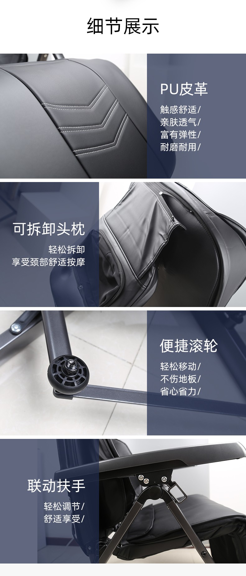 3.氣壓按摩:3檔可調(diào):腰部雙氣袋,大氣泵,腿部雙氣袋按摩,坐墊中間兩側(cè)3D按摩